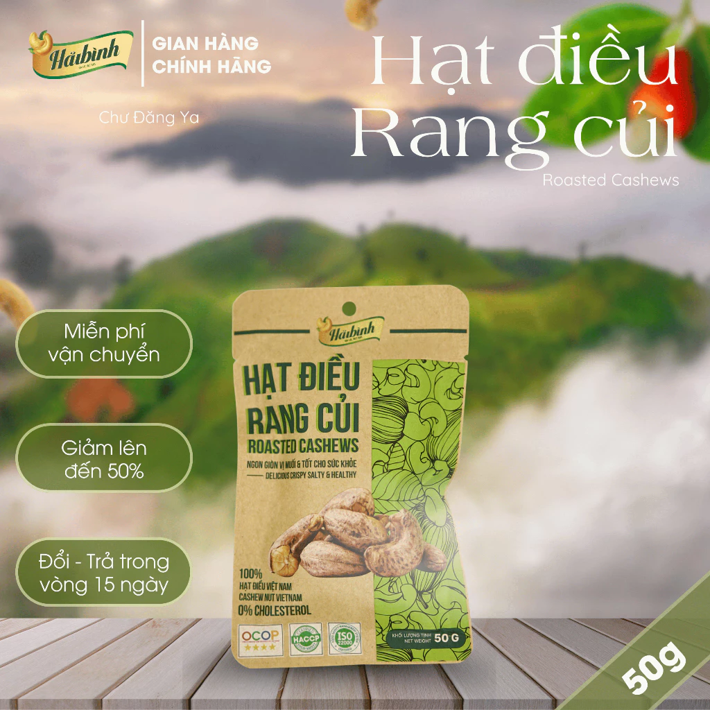 - Giá cả: Hạt điều rang củi Hải Bình Gia Lai có giá hợp lý, chỉ 26000 VND cho một túi 50g.